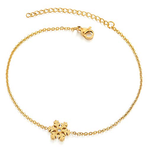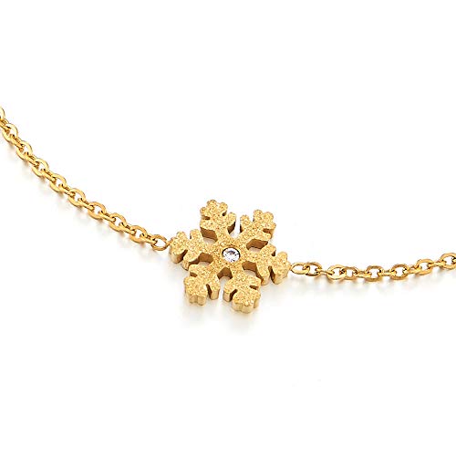 COOLSTEELANDBEYOND Acciaio Donna Colore Oro Collegamento Chain Cavigliera con Satinato Fiocco di Neve Charms, Zirconi, Regolabile