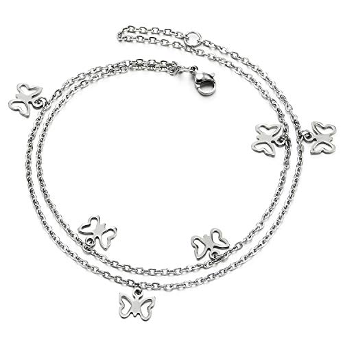 COOLSTEELANDBEYOND alla Moda Acciaio Donna Due Ranghi Contorto Collegamento Chain Cavigliera con Campana, Pendenti Farfalla, Regolabile
