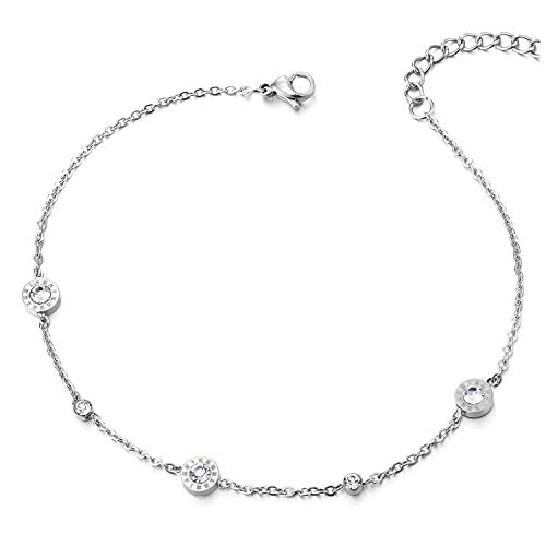 COOLSTEELANDBEYOND Acciaio Inossidabile Collegamento Chain Cavigliera da Donna con Zirconi e Numero Romano, Regolabile