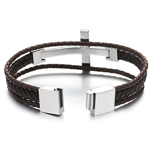 COOLSTEELANDBEYOND Acciaio Lato Orizzontale Laterale Croce Tre File Marrone Intrecciato Pelle Bracciale, Uomo Braccialetto Cuoio