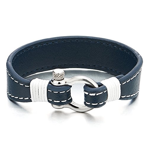 COOLSTEELANDBEYOND Vite Ancoraggio Grillo Braccialetto, Uomo Donna Bracciali Avvolgere, Blu Cuoio con Bianco Cucita, Nautico Fascia Polso