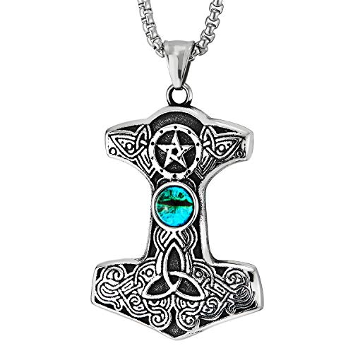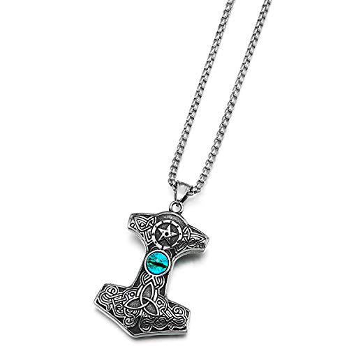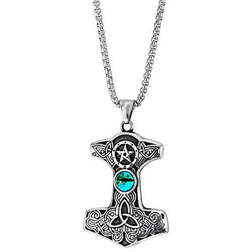 COOLSTEELANDBEYOND Annata Thors Martello Celtico Irlandese Nodo Ciondolo con Stella Blu Malocchio, Uomo Acciaio Collana Pendente Due Lati