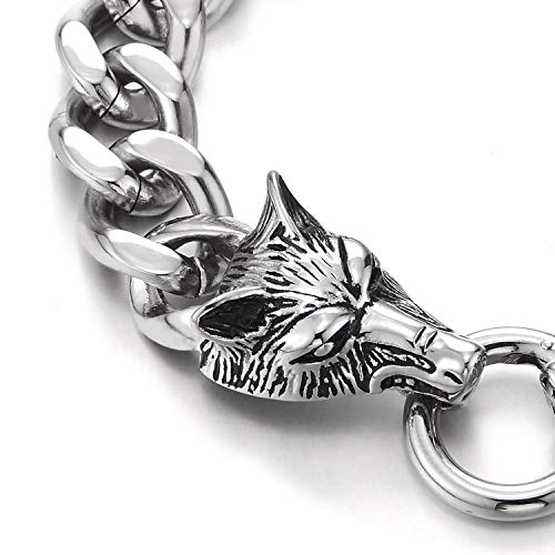 COOLSTEELANDBEYOND Biker Acciaio Braccialetto del Lupo Testa, Barbozzale, Bracciale da Uomo, Chiusura a Molla, 23CM