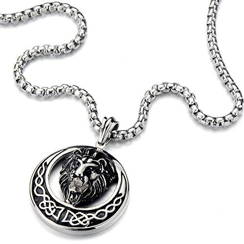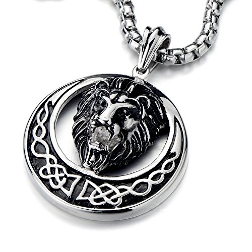 COOLSTEELANDBEYOND Biker Collana con Pendente da Uomo, Ciondolo Leone Testa, Acciaio Inossidabile, Stile Retro, Tribal, Catena Grano 75cm