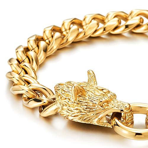 COOLSTEELANDBEYOND Biker Colore Oro Acciaio Braccialetto del Lupo Testa, Barbozzale, Bracciale da Uomo, Chiusura a Molla, 21.5CM