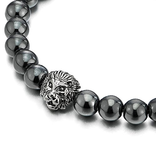 COOLSTEELANDBEYOND 8MM Braccialetto di Perline Ematite, Bracciale Fascino Uomo Donna con Testa di Leone Charms, Estensibile