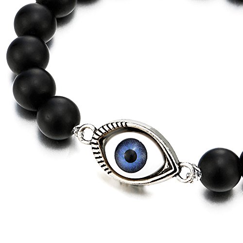 COOLSTEELANDBEYOND Braccialetto di 10MM Satinato Nero Onice Perline con Charm Malocchio Protezione, Bracciale da Uomo Donna, Prayer Mala