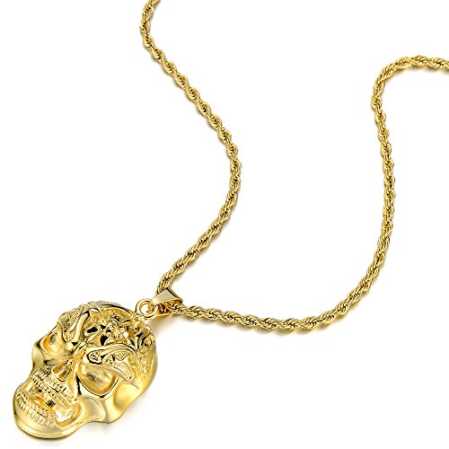 COOLSTEELANDBEYOND Or Ciondolo Teschio, Cranio Collana Pendente da Uomo, Punk, Gotico, Acciaio, Lucidato a Specchio, 75CM Corda Catena