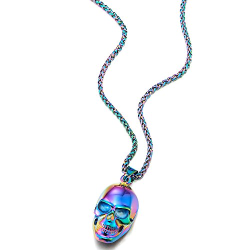 Collana con Pendente da Uomo da Donna, Ciondolo, Colorata Cranio Teschio, Acciaio, Argento, Catena del Grano 60CM