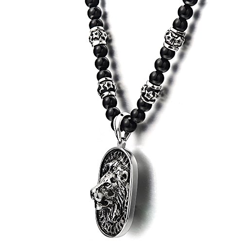 Uomo Collana di Perle Onice Nero con Testa di Leone Scudo Pendente Acciaio Inossidabile, 70CM Lungo