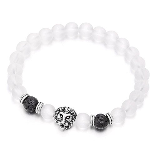 COOLSTEELANDBEYOND Uomo Donna 8MM Bianco Trasparente Perlina Braccialetto, Color Oro Testa Leone e Fascino Charms, Fascia Polso