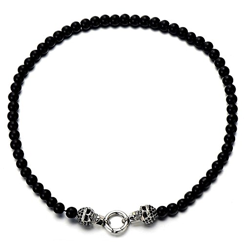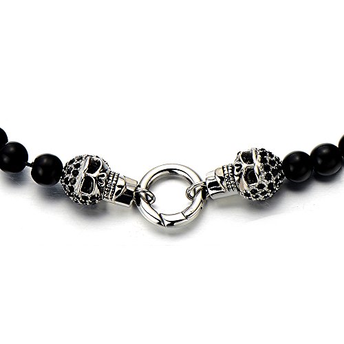COOLSTEELANDBEYOND Uomo Donna Collana di Perle Onice Nero, Cranio Teschio Pendente Acciaio Inossidabile con Nero Zirconi