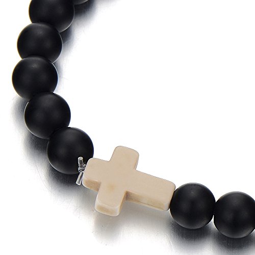 COOLSTEELANDBEYOND Donna Uomo Estensibile Bracciale, Braccialetto di Perle Onice Nero, con Croce Charm, Sintetico Nero Onice