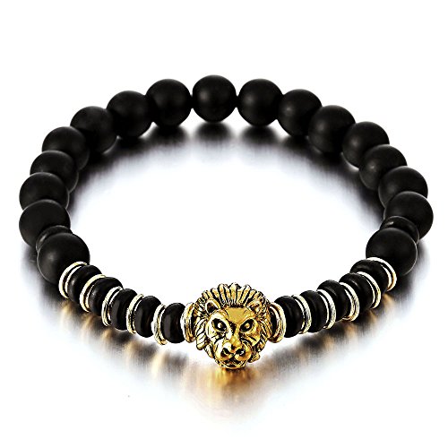 COOLSTEELANDBEYOND Uomo Donna Perlina Braccialetto con Pietra Nero Onice and Color Oro Testa Leone, Fascia di Polso, Buddhist Prayer Mala