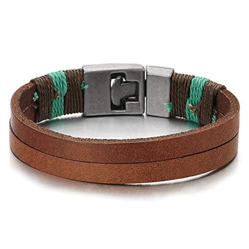COOLSTEELANDBEYOND Uomo Donna Due Ranghi Marrone Cuoio Braccialetto Cuoio Marrone Verde Cotone Corda, Fascia di Polso con Chiusura Gancio