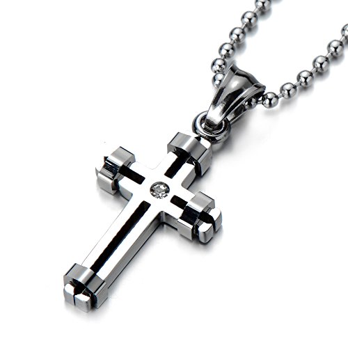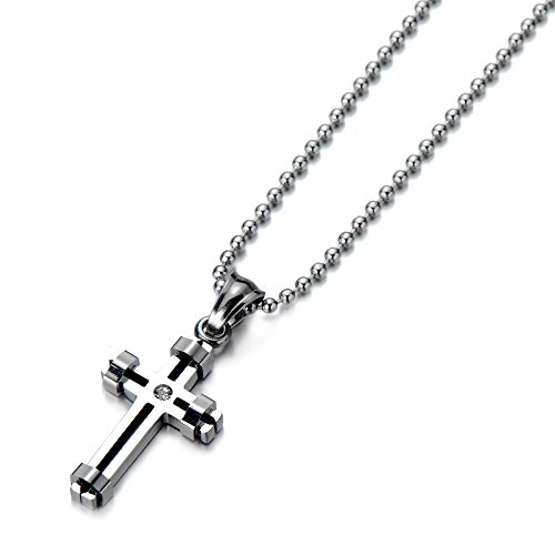 COOLSTEELANDBEYOND Doppi Strati, Ciondolo Croce, Collana con Pendente Croce da Donna Uomo, Acciaio, con zirconi, Palla Catena 75CM