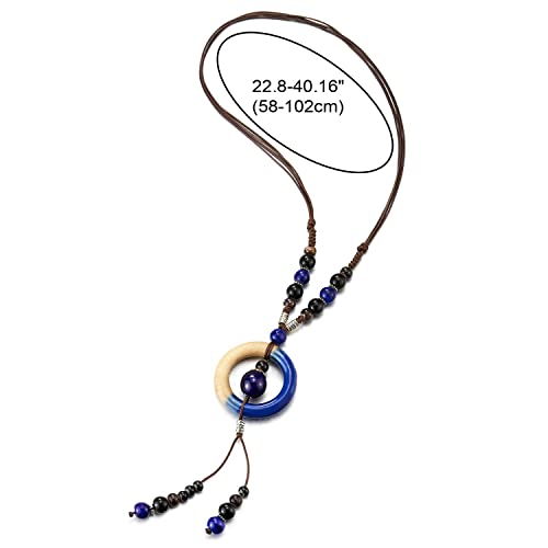 COOLSTEELANDBEYOND Boho Etnico Lunga Statement Dichiarazione Collana Legno Perline Nero Blu Pietre Catena Stringa con Cerchio Charms
