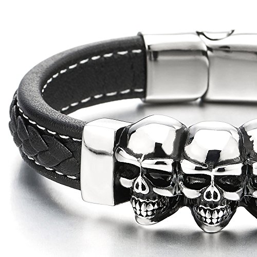 COOLSTEELANDBEYOND Gotico Biker Braccialetto con Tre Annata Cranio Teschio, Bracciale da Uomo, Acciaio, Nero Pelle Intrecciata