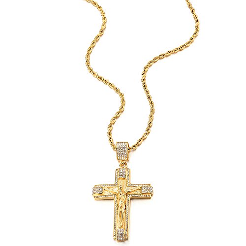 COOLSTEELANDBEYOND Grande Oro Collana con Pendente Gesù Cristo Crocifisso Croce con Zirconi, Uomo Donna Ciondolo Croce, Acciaio Inossidabile, Catena Corda 75CM
