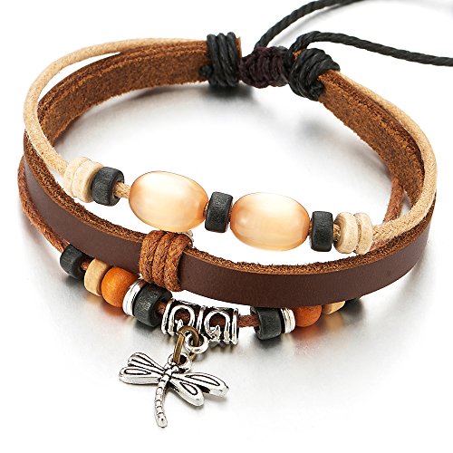 COOLSTEELANDBEYOND Libellule Perlina Bracciale Donna Ragazze Charms Braccialetto di Cuoio Marrone, Fascia di Polso, Pelle Bracciali Avvolgere