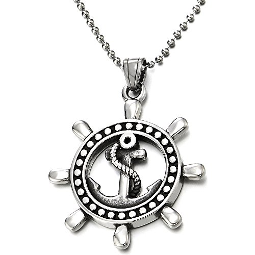 COOLSTEELANDBEYOND Marino Ruota Ancoraggio Timone Ciondolo, Collana con Pendente da Uomo Donna, Acciaio, Palla Catena 75CM