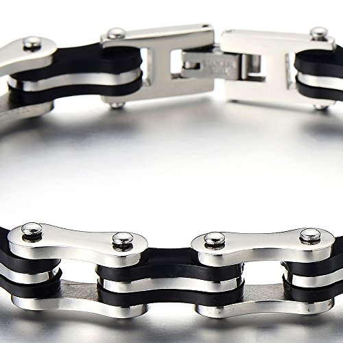 COOLSTEELANDBEYOND Maschile Bracciale da Uomo, Catena di Bicicletta, Acciaio Inossidabile, Colore Nero Argento, con Gomma Nera