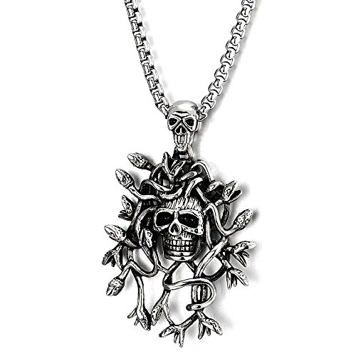 COOLSTEELANDBEYOND Medusa Serpente Cranio, Ciondolo Teschi, Collana con Pendente da Uomo Donna, Acciaio Inossidabile, Catena Grano 75CM