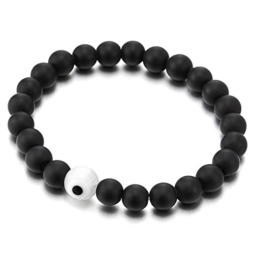 COOLSTEELANDBEYOND 8MM Nero Onice Perle, Donna Uomo Estensibile Bracciale con Bianco Malocchio Perlina Charm