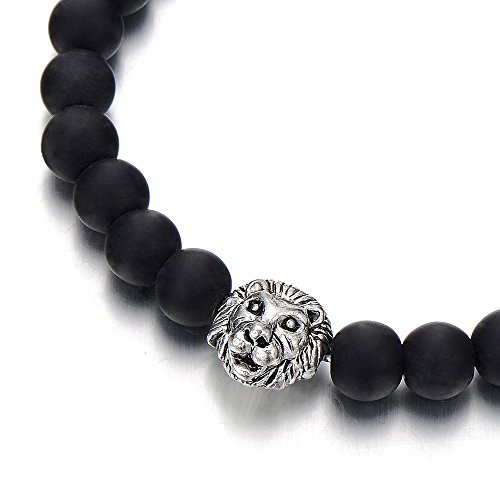 COOLSTEELANDBEYOND 8MM Nero Onice Perlina Uomo Braccialetto, Bracciale Testa Leone, Fascia di Polso, Buddhist Prayer Mala