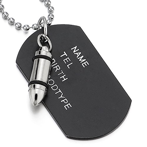 COOLSTEELANDBEYOND Due Pezzi Nero Dogtag Proiettile Ciondolo, Collana con Pendente da Uomo, Palla Catena 70CM