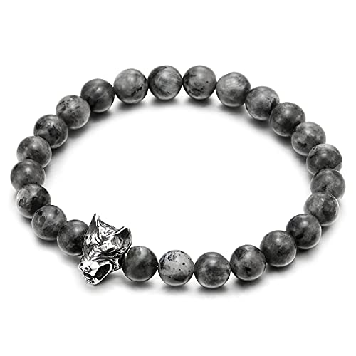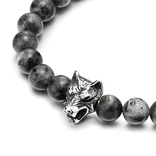 COOLSTEELANDBEYOND 8MM Nero Pietre, Uomo Bracciale Braccialetto di Perle, Acciaio Testa di Lupo Charm Fascino, Estensibile