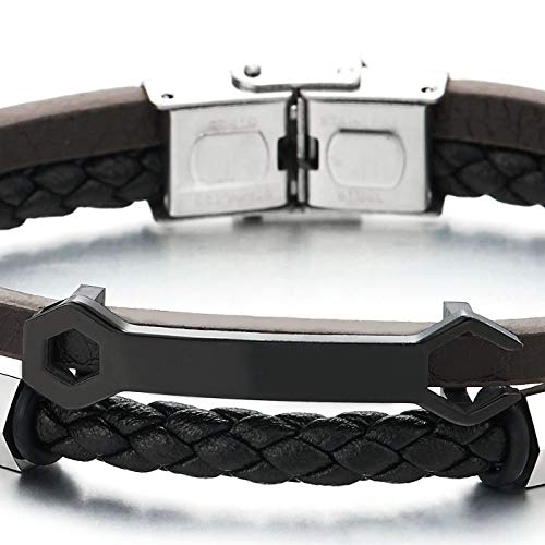COOLSTEELANDBEYOND Due Ranghi Marrone Nero Intrecciata Cuoio Bracciale da Uomo Donna, Acciaio Nero Chiave Inglese e Esagonale Charms