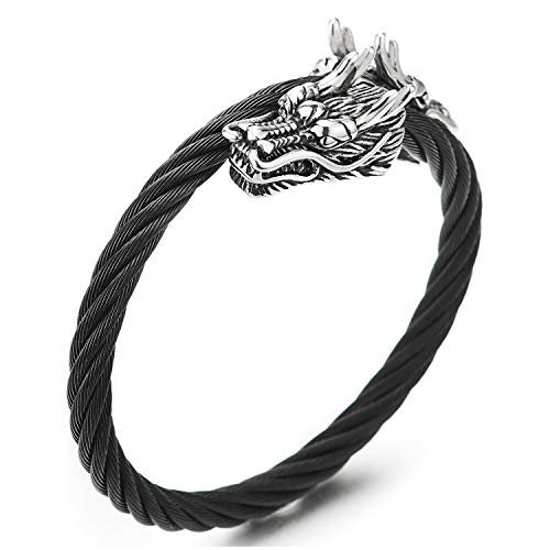 COOLSTEELANDBEYOND Regolabile Acciaio Annata Drago Testa Nero Cavo Intrecciato Polsino Braccialetto, Uomo Bracciale
