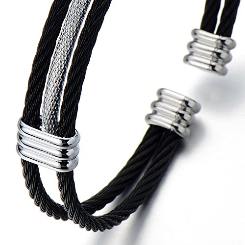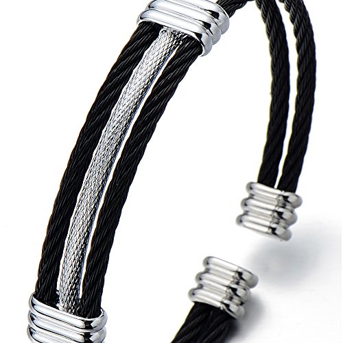 COOLSTEELANDBEYOND Regolabile EBracciale da Uomo Donna, Braccialetto del Polsino, Acciaio Inossidabile, Cavo Intrecciato, Argento Nero