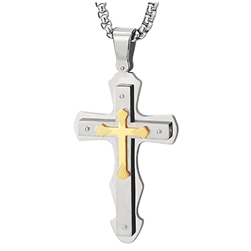 COOLSTEELANDBEYOND Tre Strati Grande Ciondolo Argento Oro Croce, Collana con Pendente Croce da Uomo, Acciaio, Catena Grano 75CM