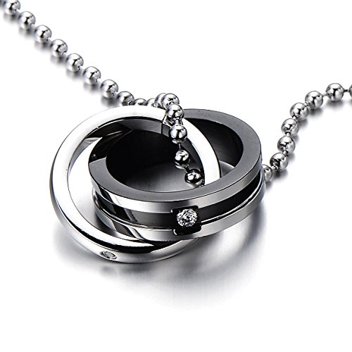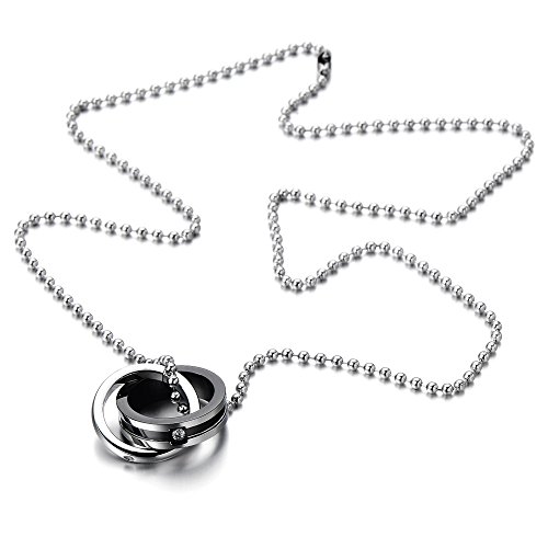 COOLSTEELANDBEYOND Unisex Collana con Pendente da Uomo Donna, Ciondolo Due Anelli Intrecciati, con Zirconi, Acciaio, Palla Catena 60CM