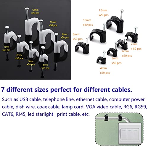 Coolty 600 Pezzi Fermacavi Rotondi, Chiodini Fermacavo, 7 Diverse Dimensioni - 4mm/5mm/6mm/7mm/8mm /10mm /12mm