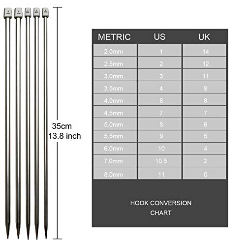AMPIA VARIETÀ DI TAGLIE - TUTTO GLI STRUMENTI DI CUI HAI BISOGNO: include 22 paia di ferri da maglia in acciaio inossidabile (da 2,0 a 8,0 mm), lunghezza 25 cm/9,8 pollici;