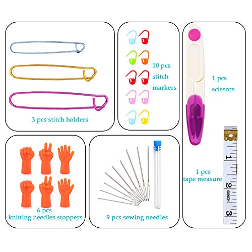 Set di Ferri da Maglia e Accessori Pratici - 11 paia di ferri da maglia dritti(2,0 mm, 2,5 mm, 3,0 mm, 3,5 mm, 4,0 mm, 4,5 mm, 5,0 mm, 5,5 mm, 6,0 mm, 7,0 mm, 8,0 mm). Accessori pratici: 1 metro a nastro, 10 segnapunti, 9 ferri da cucito per lana (3 misure, 2,0/2,3/2,7 pollici), 3 supporti per punti (3,5/4.7/5,9 pollici), 6 tappi per ferri da maglia e 1 forbici.