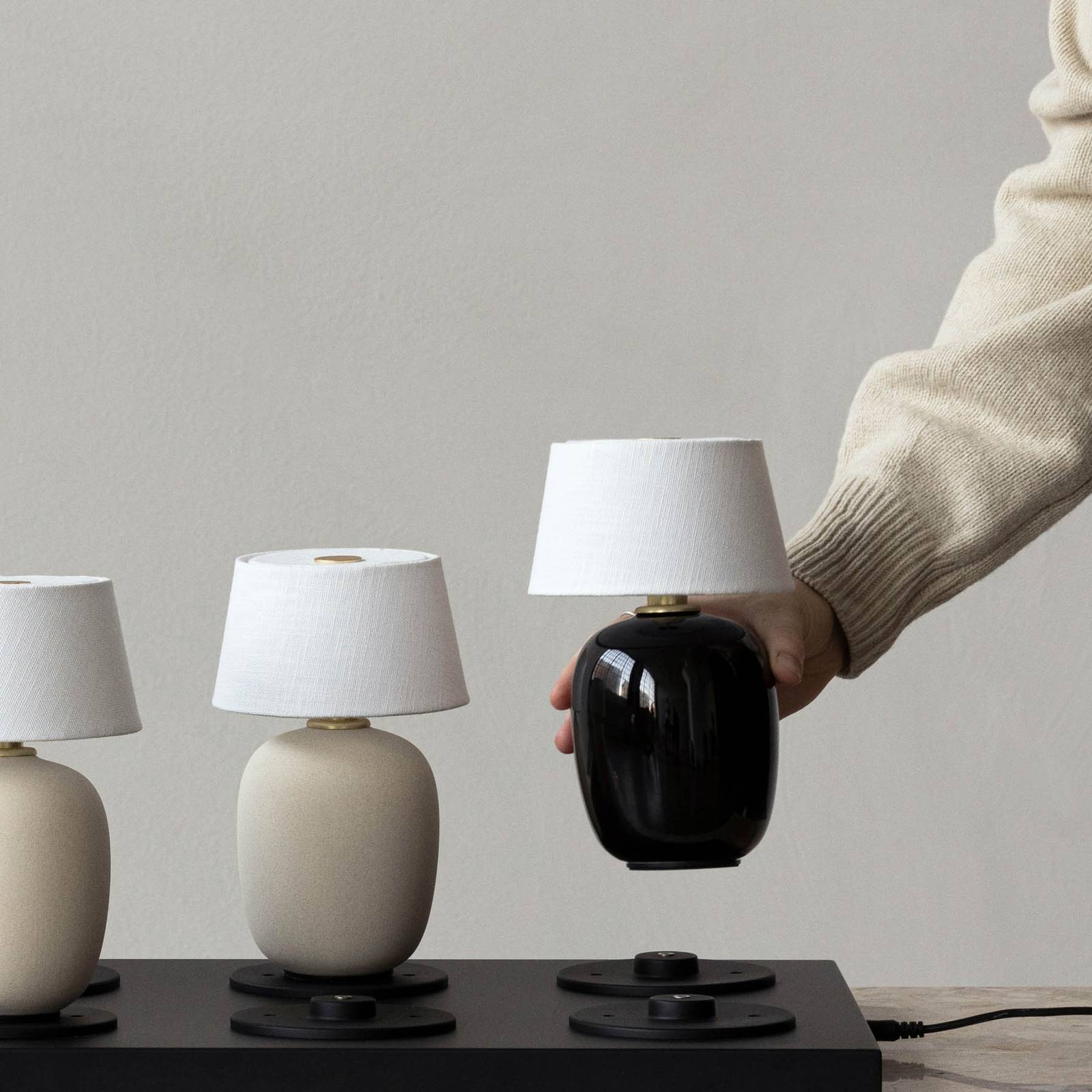 Lampada da tavolo mobile a LED Torso con batteria ricaricabile e dimmer touchClassica nel design e composta da materiali di alta qualità, Torso convince per funzionalità e semplicità. Il suo aspetto delicato e l'accogliente luce ambientale che emana dalla lampada da tavolo le conferiscono una sensazione di intimità. La base a forma di bulbo è realizzata in ceramica e presenta una superficie lucida e colorata. Porta il paralume fatto a mano in lino, che risplende in una tonalità bianca e naturale e fa apparire la luce ancora più calda e morbida. L'aspetto complessivo è sottolineato in modo decorativo da dettagli in acciaio volutamente posizionati. Sulla testa del paralume si trova un pulsante rivestito in ottone con il quale è possibile non solo accendere e spegnere la luce, ma anche modificarne la luminosità in tre fasi.Torso è dotata di una batteria ricaricabile e può quindi essere utilizzata in modo assolutamente flessibile nella zona giorno. Sotto la base è integrata una porta USB, attraverso la quale è possibile caricare la batteria con l'aiuto del cavo di ricarica USB. Per prolungare la durata della batteria, la lampada da tavolo deve essere spenta durante la ricarica e non deve essere collegata alla presa di corrente durante l'uso.La lampada da tavolo portatile Torso è stata progettata da Krøyer-Sætter-Lassen ed è la versione in miniatura della famosa lampada da tavolo di grandi dimensioni con lo stesso nome. Lo studio di design con sede a Copenhagen crea mobili e arredi per clienti di tutto il mondo. È stato fondato nel 2016 da Mads Sætter-Lassen e Emil Krøyer.