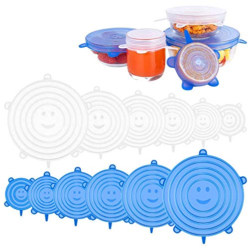 Coperchi in Silicone Elastici, 12 Coperchio in Silicone Senza BPA e Riutilizzabili, Ideali per Diversi Contenitori, Piatti, Ciotole, Sicuri in Microonde e Congelatore (Blu Bianco)