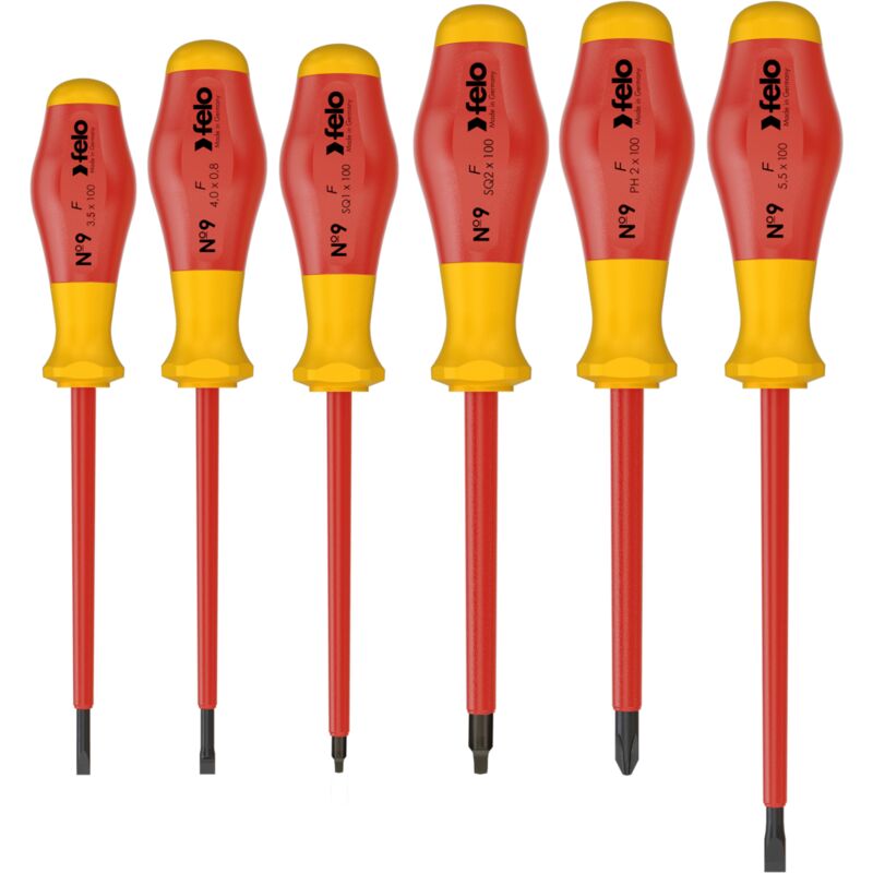 Felo N ° 9 ha un nucleo duro resistente all'impatto continuo. Il design ergonomico dell'impugnatura e il maneggio piacevolmente morbido consentono una coppia elevata. Secondo IEC 60900: 2018, singoli pezzo testato con 10.000 V per un lavoro sicuro fino a 1.000 V.