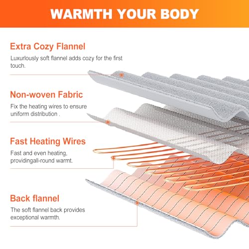 Morbide e comode: a differenza della maggior parte delle coperte elettriche, la nostra è realizzata in flanella double face per fornire un'eccellente ritenzione del calore e un'esperienza delicata sulla pelle. Perfetto per renderti accogliente sul divano, sul divano o a letto e nella stagione fredda.