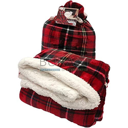 Coperta singola 150x200 double face pelliccia ecologica scozzese e retro morbidissimo agnellino ecologico - confezionato in un sacco dello stesso materiale chiuso con pompom