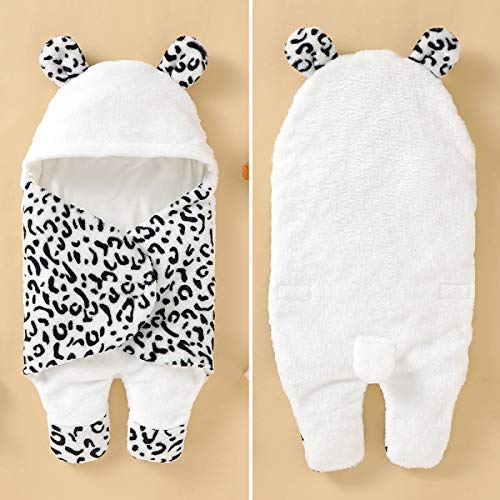 Coperta Swaddle con Cappuccio per Bambini Neonato Che Riceve Coperta in Pile Swaddle Sacco a Pelo Sacco per Neonati E Ragazze (Leopardo bianco)