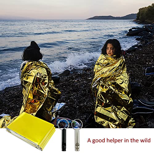 【Incluso nel pacchetto】 Riceverai 2 coperte di sopravvivenza di emergenza in oro e argento e 2 fischietti di sopravvivenza.