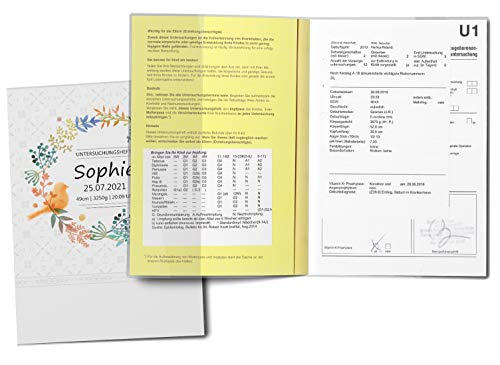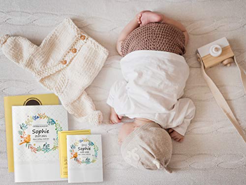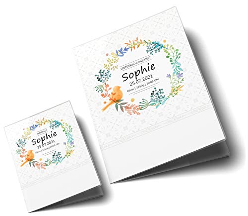 Olgs, set copertina per libretto pediatrico con ghirlanda di fiori, custodia per libretto sanitario, inclusa copertina per libretto vaccinazioni personalizzabile con nome e data di nascita