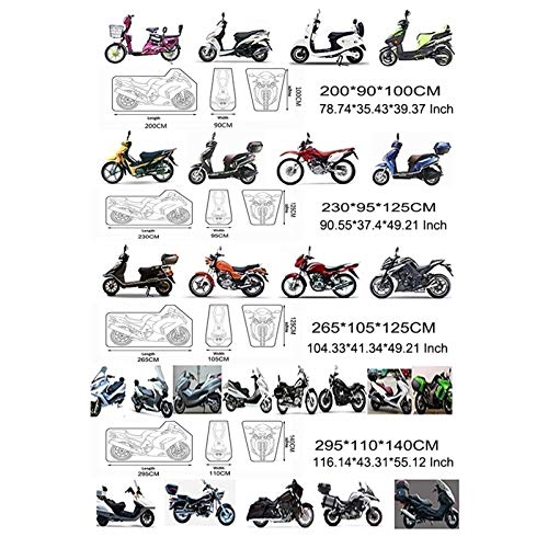 Dimensione Modelli applicabili: la copertina del motociclo ha 4 dimensioni tra cui scegliere, le sue dimensioni possono coprire quasi tutte le motociclette a due ruote, la dimensione migliore è la lunghezza della moto + 20 cm