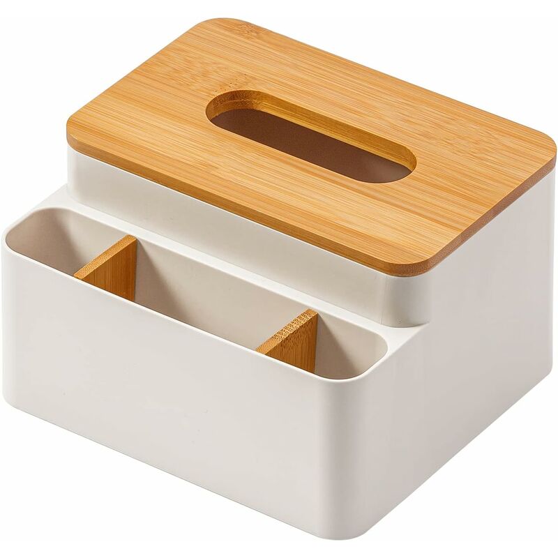 Materiale: il supporto della scatola dei fazzoletti è realizzato in materiale acrilico di alta qualità, resistente e semplice. è pressato da bambù naturale, non è robusto come il metallo, ma i nostri materiali sono più semplici e adatti allo stile moderno. Multifunzionale: il supporto per il coperchio della scatola del tessuto con 3 scomparti portaoggetti per telecomandi, telefoni cellulari, occhiali, penne e altri accessori per ufficio. Design: il design semplice è adatto a tutti i tipi di ambienti domestici moderni. Il materiale in acrilico conferisce una bellezza semplice e moderna. La copertura in bambù porta la natura nei tempi moderni. La combinazione dei due elementi è una moda senza tempo. Dimensioni: la dimensione interna del supporto per la scatola dei tessuti è 8 x 4 x 4 pollici. Dimensioni generose per contenere la maggior parte delle scatole dei tessuti di dimensioni standard e pile di salviette o fazzoletti per il viso individuali