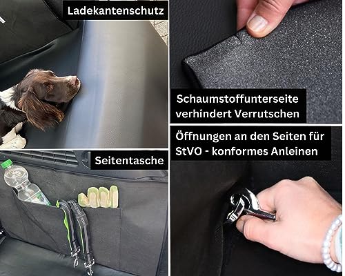 Protezione e comfort perfetti: la copertura per auto impermeabile e robusta (superficie in ecopelle) con robusti pannelli laterali in tessuto non tessuto PP protegge l'intero bagagliaio e il bordo di carico. La parte inferiore in gommapiuma della superficie di appoggio in ecopelle è imbottita.